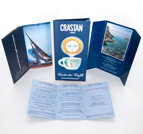 - Formato A4 aperto/9,8×21 cm chiuso – 4 colori b/v su patinata 130 g – 2 pieghe, 3 ante